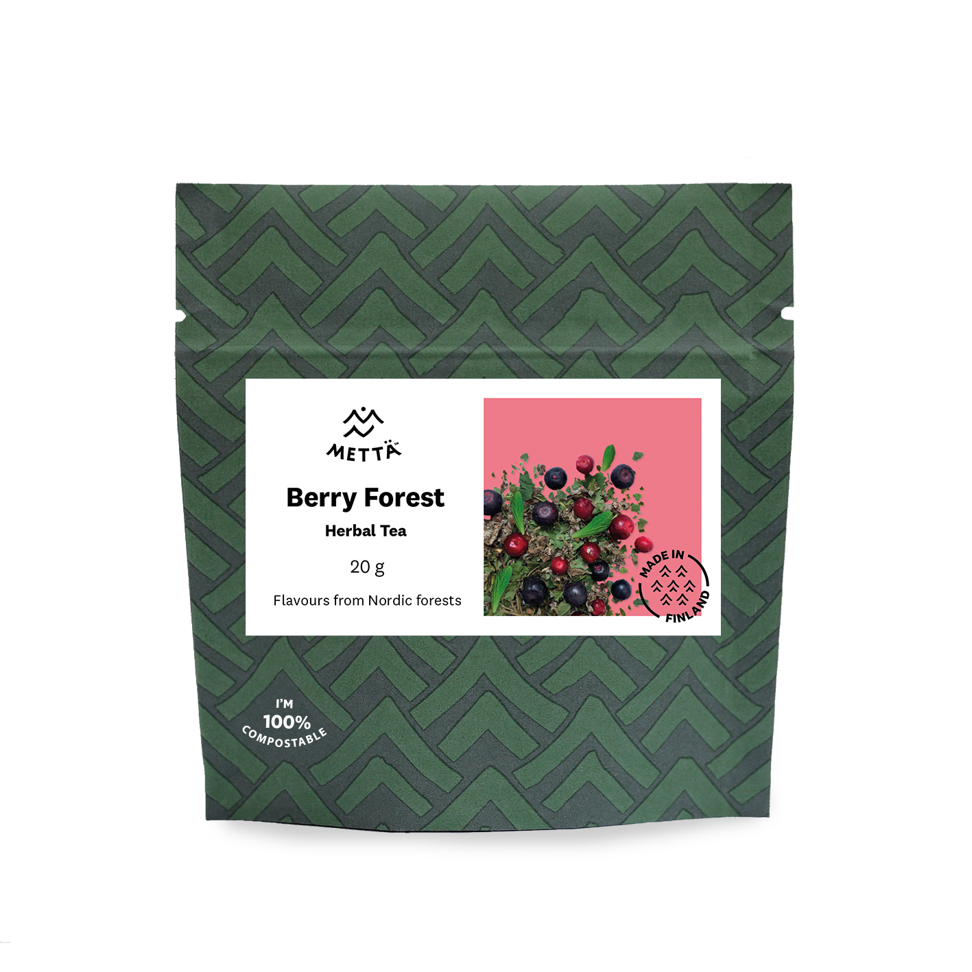 Bärskogen : Om du kunde fånga essensen av en födosökspromenad i de magiska finska skogarna och placera den i en kopp, hur skulle det smaka? Vi har räknat ut det åt dig. Vårt Berry Forest örtte är en noggrant utvald blandning av finska vilda bär, bärblad och gran. Njut som örtte eller lägg direkt i din smoothie. Naturligt koffeinfri. Rekommenderas inte för gravida kvinnor
