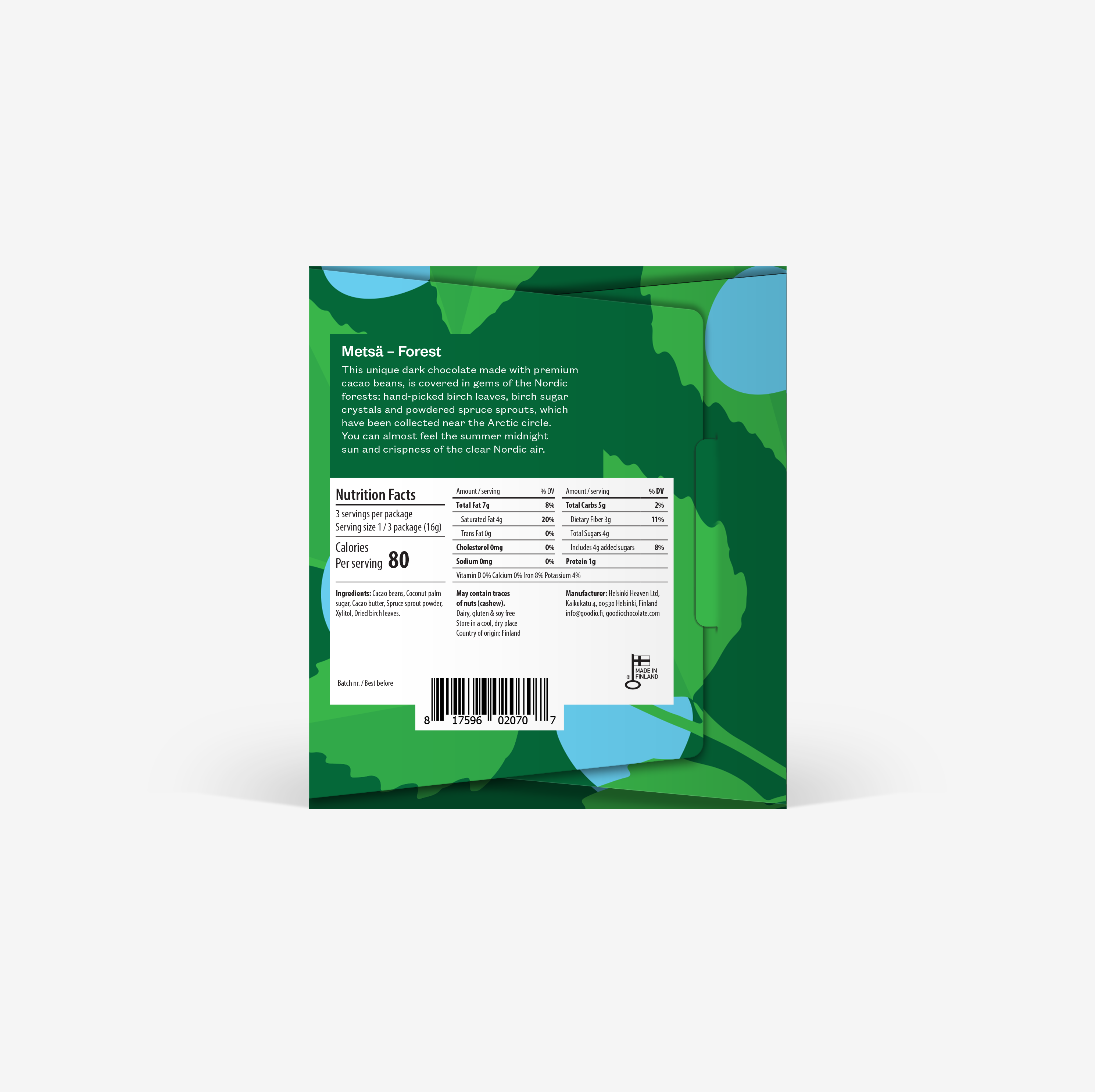 Skogschoklad är toppad med autentiska smaker av skogen. Denna smak innehåller några av byggstenarna i det nordiska skogslandskapet: björk och gran.