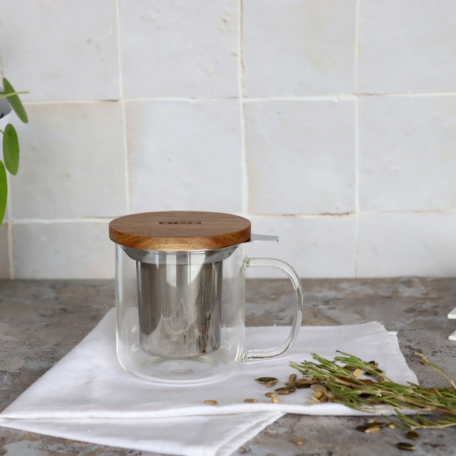 Denna infusionsmugg är perfekt för dina teer, örtdrycker och andra infusioner. Den dubbla väggen håller din dryck varm längre och undviker att brännas vid hantering av koppen och med dess rena linjer och lock i akaciaträ kommer att ge cocooning och naturlighet till dina testunder.